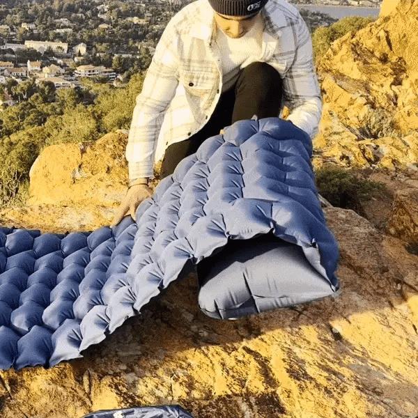 Il nostro materassino gonfiabile è progettato per uno sgonfiaggio rapido e senza sforzo. Basta aprire la valvola situata all’estremità del cuscino, piegare il materassino in 3 parti uguali, quindi arrotolarlo. In meno di 1 minuto, è pronto per essere riposto nel suo sacchetto!